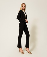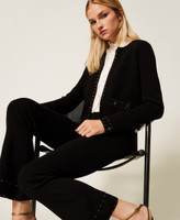 Stretch viscose plain knit trousers with rhinestone studs, elasticated waist, Oval T logo plate, flared.