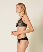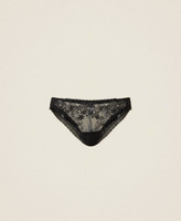 Scalloped lace Brazilian briefs with floral motif, organza bow and heart-shaped metal logo at the centre on the back.
