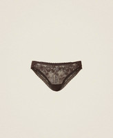 Scalloped lace Brazilian briefs with floral motif, organza bow and heart-shaped metal logo at the centre on the back.