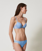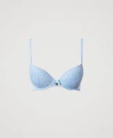 Tulle and lace push-up bra with flower and leaf pattern. Removable padding, scalloped neckline, adjustable shoulder straps made from logo elastic, two-hook back fastener, heart-shaped metal logo plate with satin and lace bow between the cups.