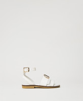 Leather flat sandals with ankle strap and metal Oval T detail, rubber sole.