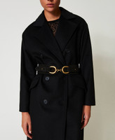 High waist suede-effect belt with decorative clasp buckle at the front and adjustable closure with pins at the sides.