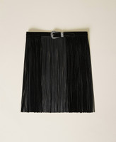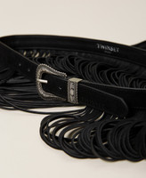 Leather belt, regular waist, Texas style buckle, long fringes, heat-printed logo on the tip.