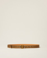 Low waist leather belt with tejus print and faux leather on the inside. Closure with brass Oval T buckle with rhinestones and seven holes.