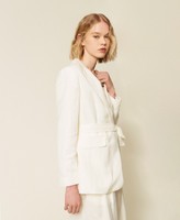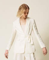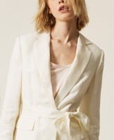 Linen and viscose blazer with matching removable belt tied at the waist. Lapels, single button fastening, long sleeves, front welt pockets, slit at the back, cotton muslin lining, heart-shaped metal logo, straight fit.