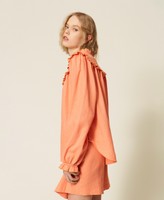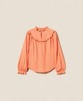 Linen and viscose blend blouse made in Italy, finished with micro ruffles with contrasting colour trim. Band collar, teardrop opening with button, long sleeves with elasticated cuffs and ruffles, loose fit. This item is part of the “Archive” range, inspired by the most iconic and most loved garments from the Twinset collections.