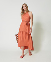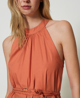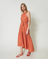 Long stretch cotton poplin dress with gathered flounces, halter neck, side zip, matching woven belt with Oval T.