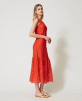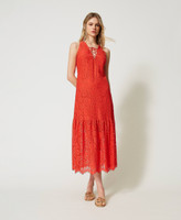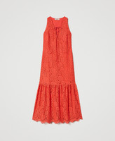 Long dress made from floral rébrodé macramé lace, V neck with tonal weaved trim, lining.