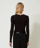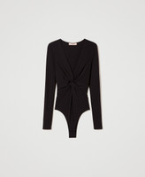 Bodysuit made from viscose crêpe jersey with long sleeves, V neck and criss-crossed knot, snap button closure.