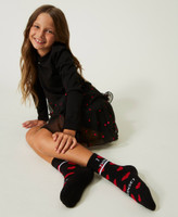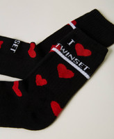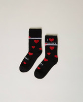 Long socks with hearts all over and contrasting jacquard lettering logo.