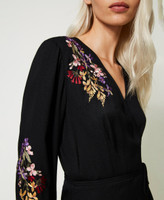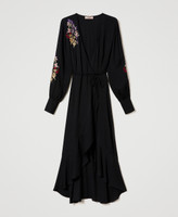 Long wrap-around dress made from viscose crêpe, with placed multicolour floral thread-embroidery, surplice V neck.