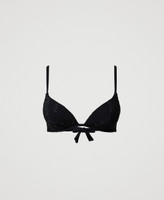 Triangle bikini top made from solid colour fabric doubled with rhinestone mesh, with non-removable cups.