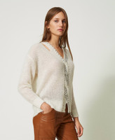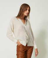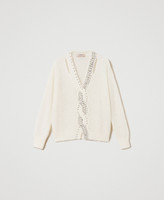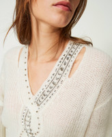 Full cardigan stitch jumper made from wool and mohair blend, with inlaid cable work and placed handmade embroidery.