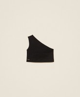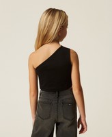 Girls' one-shoulder stretch cotton jersey top with metal logo plate on the side, fitted.