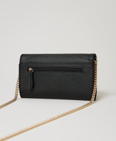 Saffiano print leather-like phone holder with flap and magnet, metal Oval T logo, chain strap.