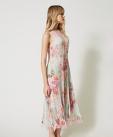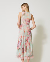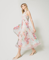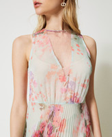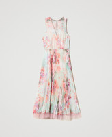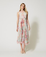 Romantic, delicate, elegant. Choose the midi dress made from Italian creponne fabric with Twinset-exclusive star and flower print. Straight fit, round neck with see-through plumetis tulle insert, tailored waist with sunray pleated skirt, raw cut tulle hem, side zip closure, georgette lining. Perfect for a special occasion.
