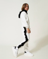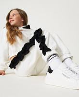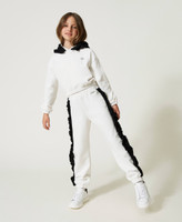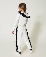 Cotton plush fabric trousers with contrasting colour ruffles at the hips, elasticated waist and hem.