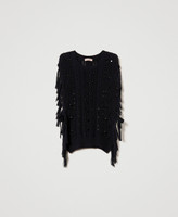 Cotton poncho jumper with mixed stitches and mesh and handmade faceted stone embroidery, fringe trim on the hips, loose fit.