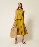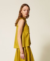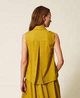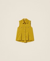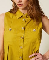 Stretch cotton poplin shirt with patch pockets and metal buttons. With volume-defining pleats at the front, logo button fastening, fit & flare silhouette.