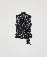 Printed crêpe de Chine top with wrap-around sash closure, shawl neck, sleeveless.