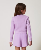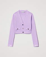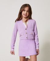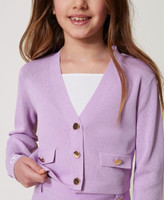 Girls' short flat-ribbed viscose blend knit cardigan with jacquard Oval T cuffs. V-neck, gold-tone button fastening, long sleeves, logo plate on the back, straight fit.