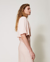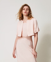 Viscose satin shrug with a round neck, edge-to-edge concealed snap fastening, short balloon sleeves, Oval T logo tab on the back and a straight fit.