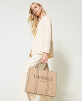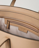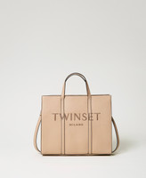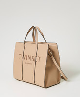 Leather-like shopper with hot-pressed embossed logo, double handle, removable shoulder strap, zip.