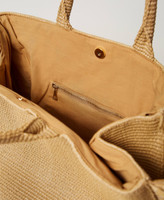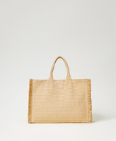 Shopper made from tapestry-like woven jute, frayed side edges, contrasting logo embroidery, magnet closure and double tubular handle.