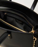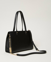 Smooth leather-like shopper with Oval T in front, double on-shoulder handle, removable strap with chain insert and logo.
