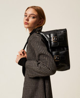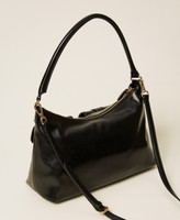 Semi-polished faux patent calfskin leather shoulder bag with natural grain effect. Two front pockets with magnet closure, metal buckles and loops with engraved logo, zip closure, tubular handle that can be worn over the shoulder and removable and adjustable shoulder strap for cross-body wear. Lining and internal pockets.