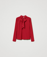 Blouse made from soft feel viscose and silk crêpe de Chine with pussy bow tie neck. Opening on the back with button and eyelet, long loose sleeves with cuffs and buttons, no lining, straight fit.