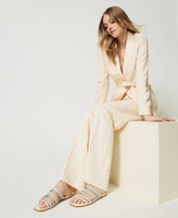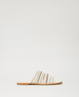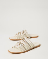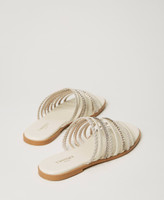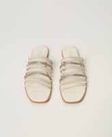 Smooth leather and suede slides with plaited and full rhinestone bands, tunit sole.
