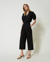 Cropped trousers made from stretch cotton poplin, straight fit, with high waist, mannish zip and hook, slant pockets and permanent crease.