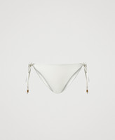 Solid colour thong bikini bottom with adjustable side ties with metal ends with rhinestones, heart-shaped logo on the back. Lined.