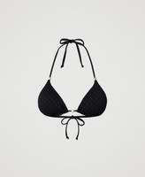 Triangle bikini top with broderie anglaise, padded with removable cups and decorative marble-like element at the centre.