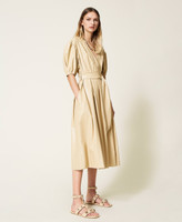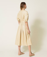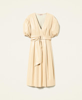 Coated fabric wrap-around dress with V neck, gathered sleeves, matching sash belt.