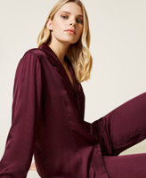 Длинная пижама из вискозного атласа с окантовкой, состоящая из жакета на пуговицах и брюк-палаццо.