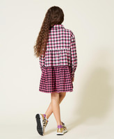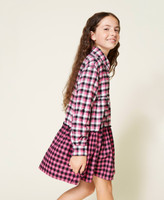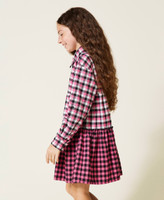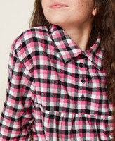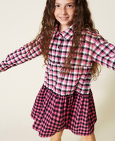 Короткое платье в клетку из фланели, окрашенной в пряже, с рубашечным воротником, застежкой на пуговицы, длинными рукавами и контрастной юбкой.