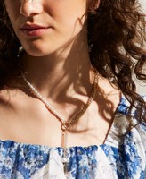 Ожерелье из двойного материала, состоящее из цепочек и жемчуга. Изделие имеет две подвески с жемчугом, медальон с надписью-логотипом и застегивается на подпружиненный карабин.