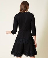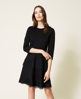 Короткое платье из трикотажа Милано с кружевными оборками, круглой горловиной и рукавами длиной три четверти.